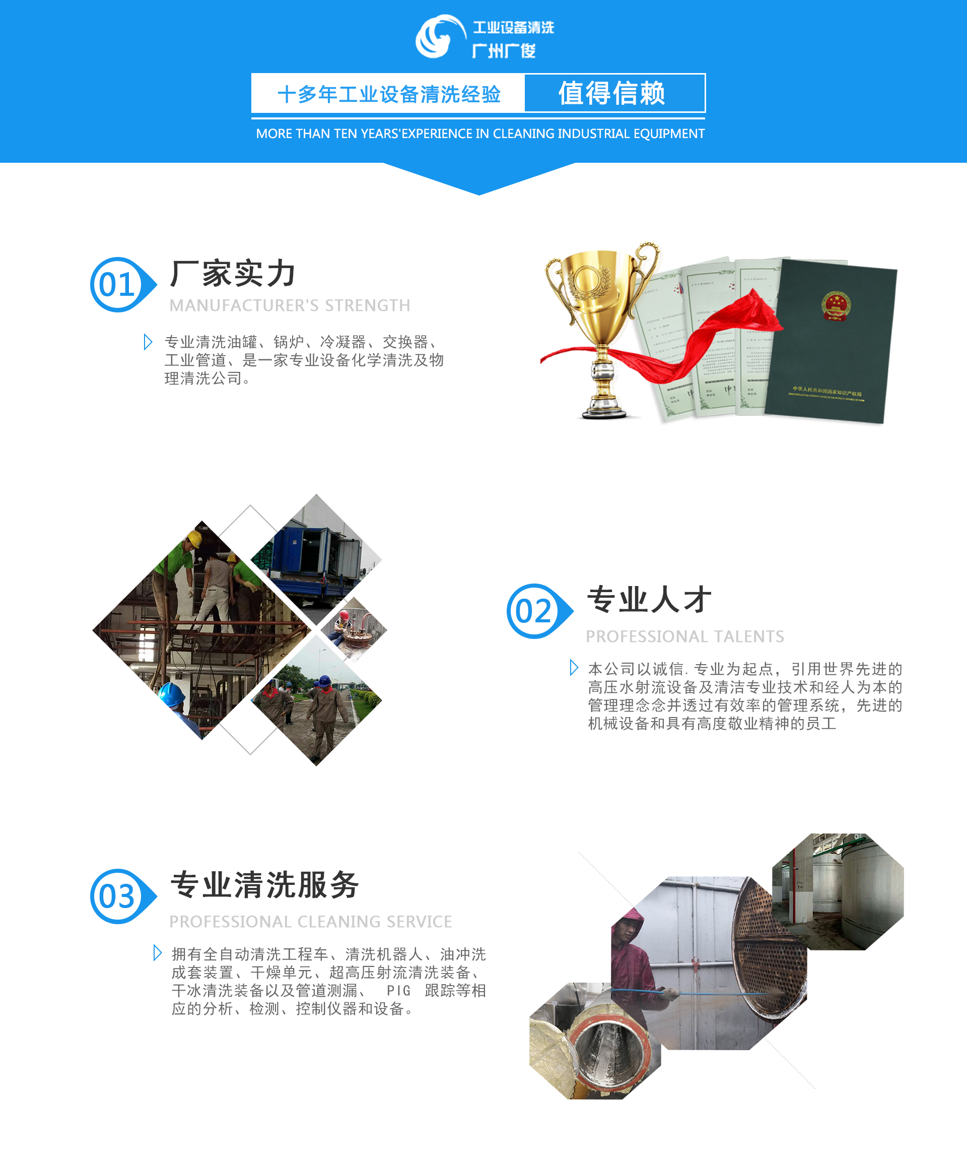 廣州廣俊清洗有限公司是一家從事各種工業(yè)設(shè)備清洗、化學(xué)清洗、物理清洗、高壓水射流清洗清洗公司。本公司清洗油罐、鍋爐、工業(yè)設(shè)備、是一家設(shè)備化學(xué)清洗及物理清洗公司。本公司以誠(chéng)信為起點(diǎn),引用世界先進(jìn)的高壓水射流設(shè)備及清潔技術(shù)和經(jīng)人為本的管理理念念并透過(guò)有效率的管理系統(tǒng),先進(jìn)的機(jī)械設(shè)備和具有高度敬業(yè)精神的員工;“想客戶(hù)所想,做客戶(hù)所求,超客戶(hù)所望,敬業(yè)進(jìn)取,誠(chéng)信負(fù)責(zé)”的宗旨。立足環(huán)保,服務(wù)社會(huì)。我們承諾為每位客戶(hù)提供物...